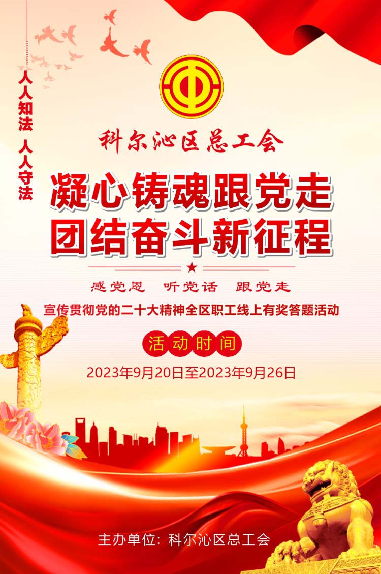 為進(jìn)一步學(xué)習(xí)貫徹落實(shí)黨的二十大精神,教育引領(lǐng)廣大職工“感黨恩、聽黨話、跟黨走”,凝心聚力完成“五大任務(wù)”,全方位建設(shè)模范自治區(qū),提升廣大職工學(xué)法、知法、守法意識(shí),形成“人人皆知、人人有責(zé)”的良好法治氛圍,科爾沁區(qū)總工會(huì)決定開展“凝心鑄魂跟黨走 團(tuán)結(jié)奮斗新征程”宣傳貫徹黨的二十大精神暨全區(qū)職工線上有獎(jiǎng)答題活動(dòng)。
